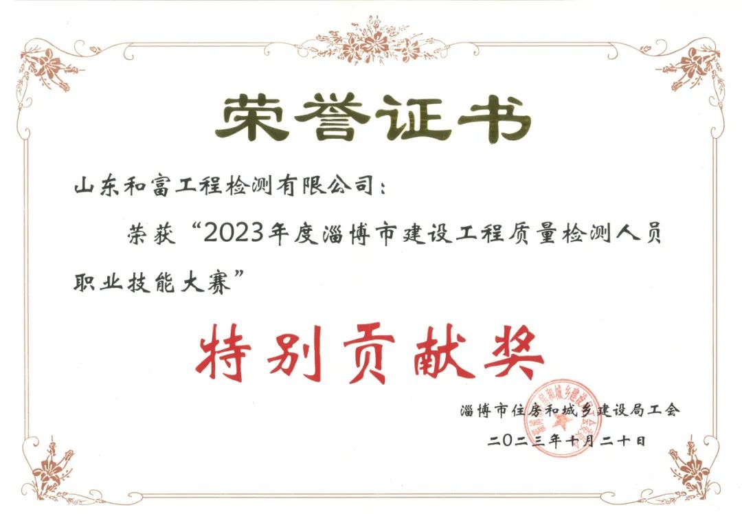 淄博市第二届建设工程质量检测人员技能大赛于10月18日圆满落下帷幕,山东和富工程检测有限公司喜获“特别贡献奖”。